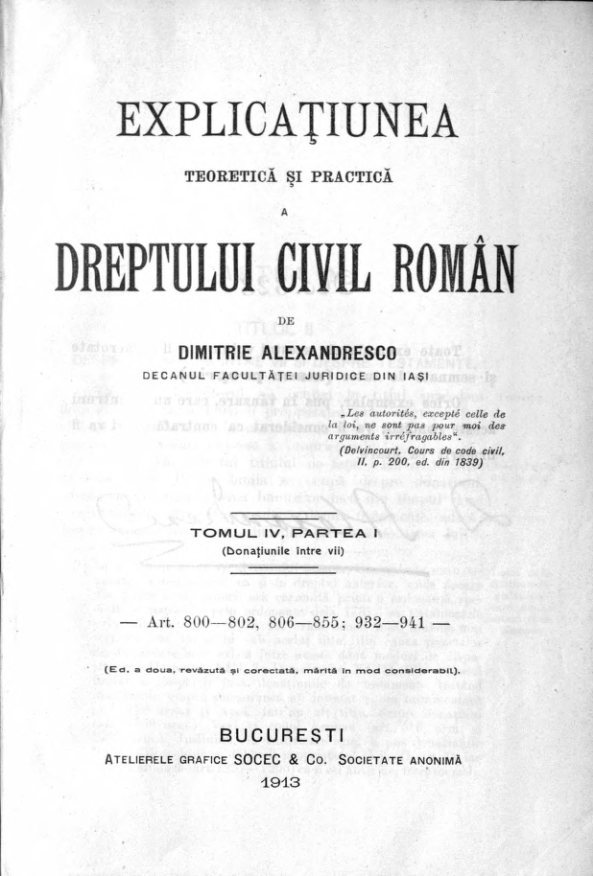 Alexandresco, Dimitrie. Explicaţiunea teoretică şi practică a dreptului civil român în comparaţiune cu legile vechi şi cu principalele legislaţiuni străine. Tom. 4, Partea 1 (1913)