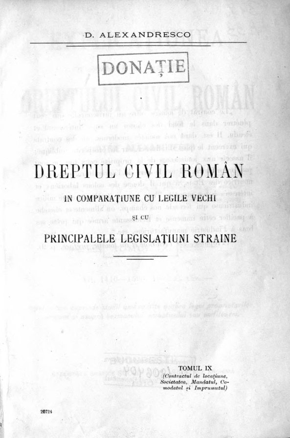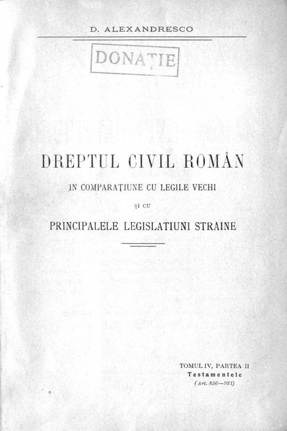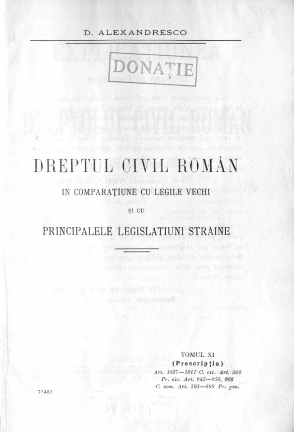 Alexandresco, Dimitrie. Explicaţiunea teoretică şi practică a dreptului civil român în comparaţiune cu legile vechi şi cu principalele legislaţiuni...