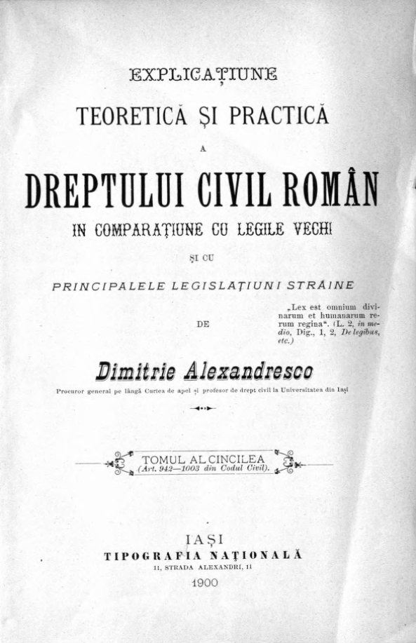 Alexandresco, Dimitrie. Explicaţiunea teoretică şi practică a dreptului civil român în comparaţiune cu legile vechi şi cu principalele legislaţiuni străine. Tom. 5 (1900)