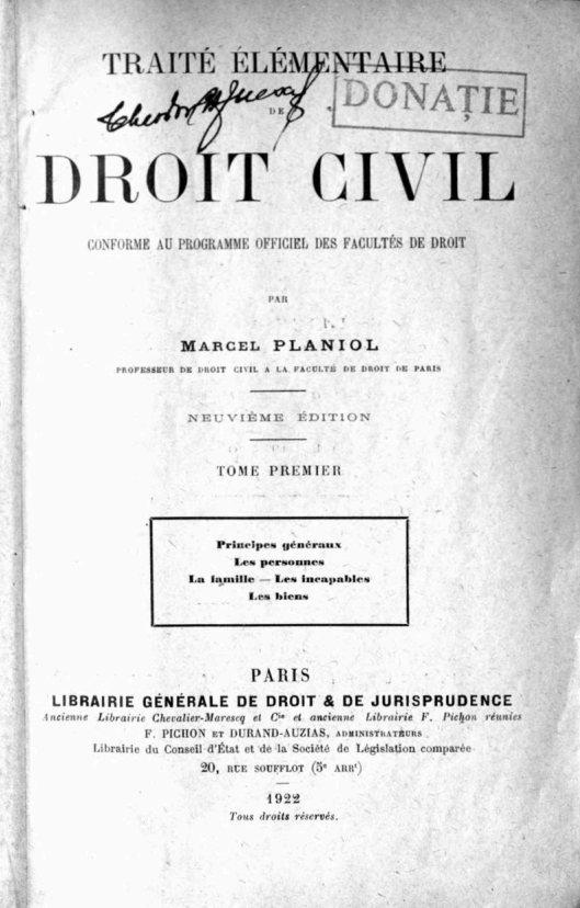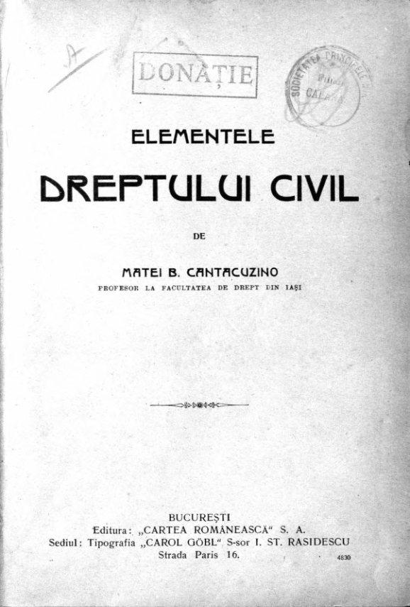 Cantacuzino, Matei B. Elementele dreptului civil / Matei B. Cantacuzino. – Bucureşti : Editura Cartea românească, 1921. – 762 p...