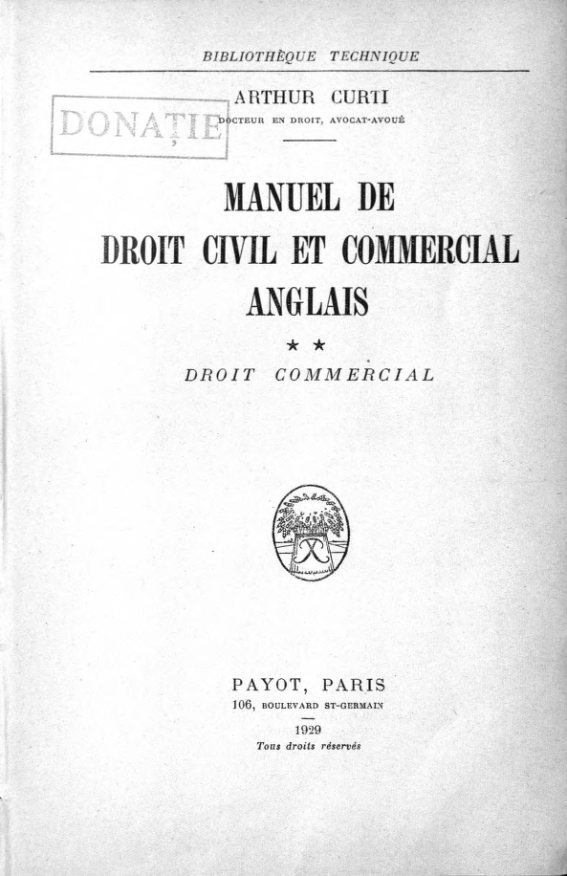 Curti, Arthur. Manuel de droit civil et commercial anglais. T. 2 : Droit commercial / Arthur Curti. – Paris : Payot, 1929. – 463 p. – (Bibliothèque...