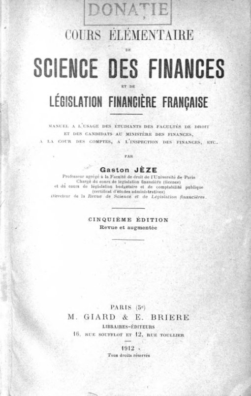 Jèze, Gaston. Cours élémentaire de science des finances et de législation financière française (1872)