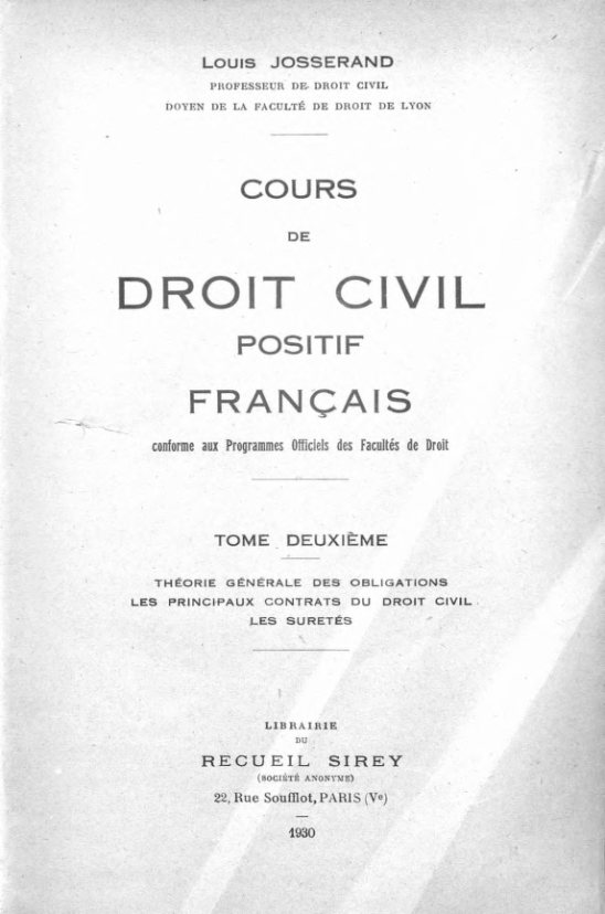 Josserand, Louis. Cours de droit civil positif français : conforme aux Programmes Officiels des Facultés de Droit. Tome deuxième : Théorie générale...