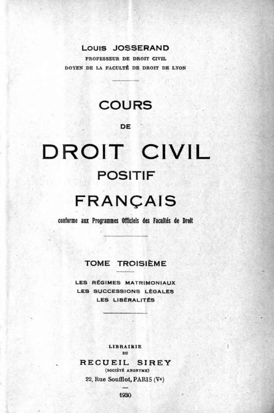 Josserand, Louis. Cours de droit civil positif français : conforme aux Programmes Officiels des Facultés de Droit. Tome 3 (1930)