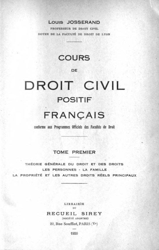 Josserand, Louis. Cours de droit civil positif français : conforme aux Programmes Officiels des Facultés de Droit. Tome premier : Théorie générale du...