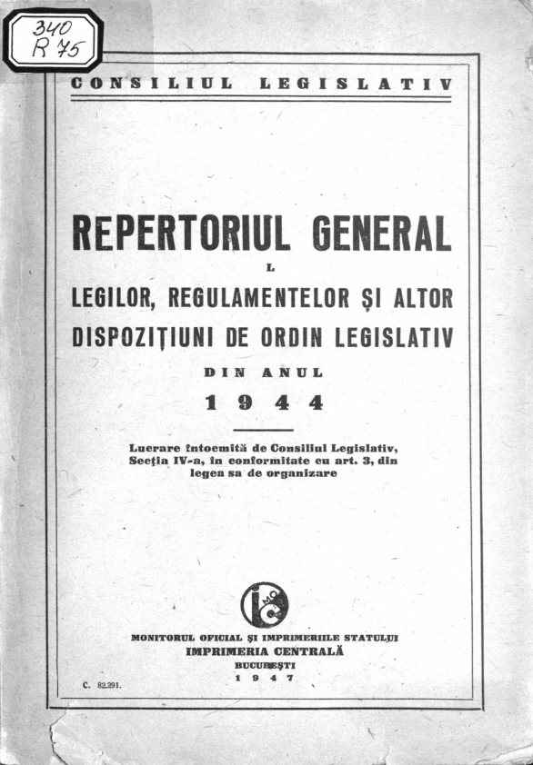România. Consiliul Legislativ. Repertoriul general al legilor, regulamentelor şi altor dispoziţiuni de ordin legislativ din anul 1944 (1947)