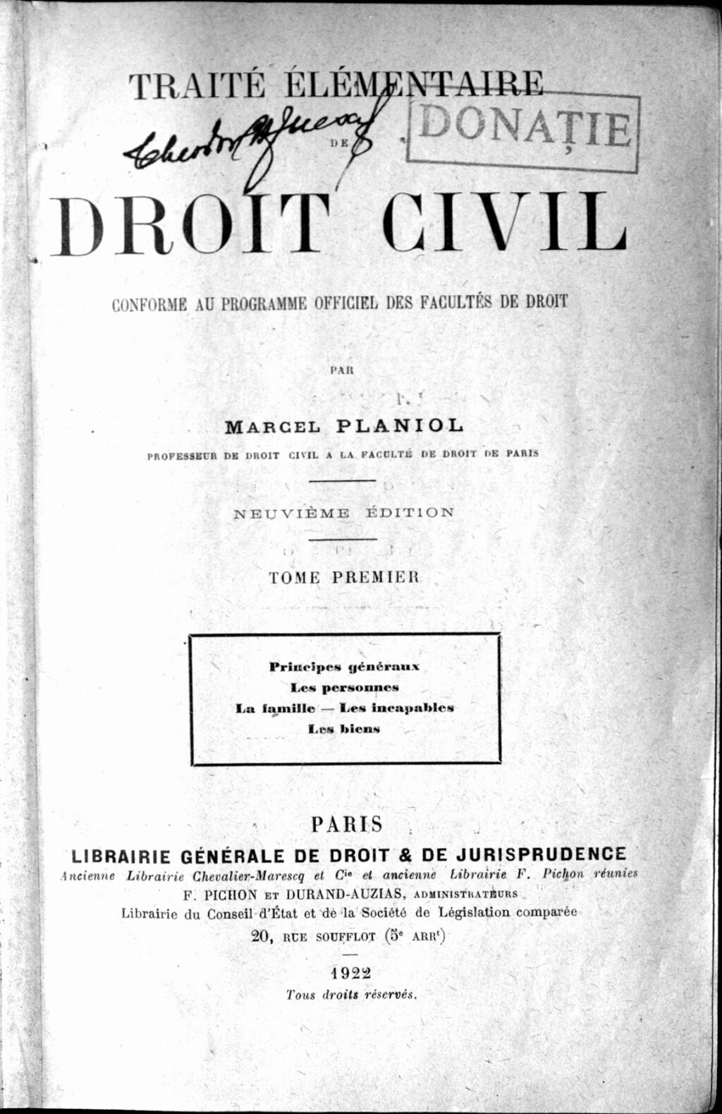 Planiol, Marcel. Traité élémentaire de droit civil : conforme au programme officiel des facultés de droit. Tome 1 : Principes généraux. Les personnes. La famille — les incapables. Les biens / Marcel Planiol. – 9ème édition. – Paris : Librairie Generale de Droit et de Jurisprudence, 1922. – XII, 1026 p. – Table alphabétique des matières: p. 985-1014.