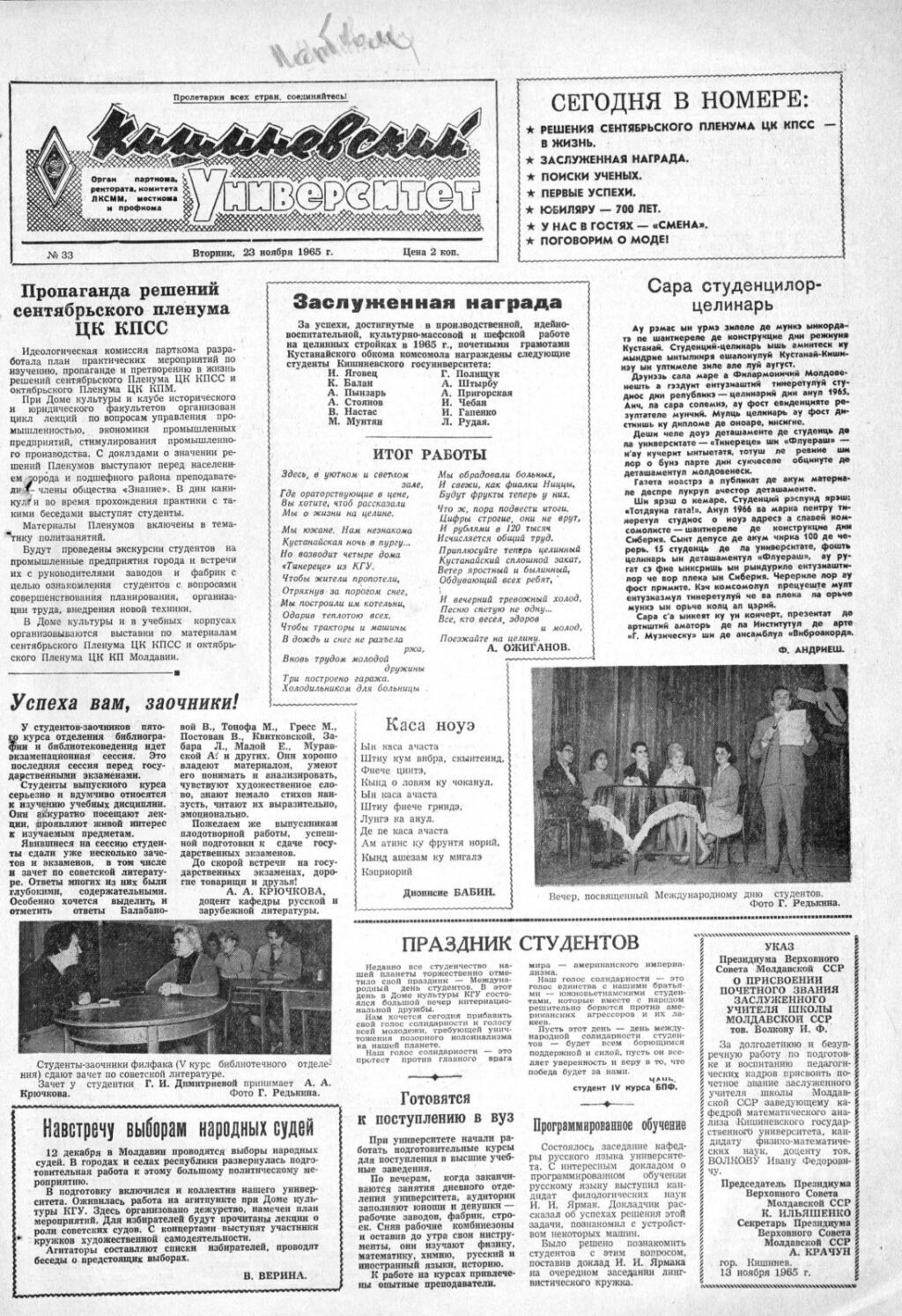 Ziarul USM – Nr. 33 – 23 noiembrie 1965
