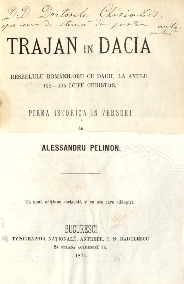 Pelimon, Alexandru. Traian în Dacia. Războiul romanilor cu dacii la anul 102-105 după Hristos : poemă istorică...