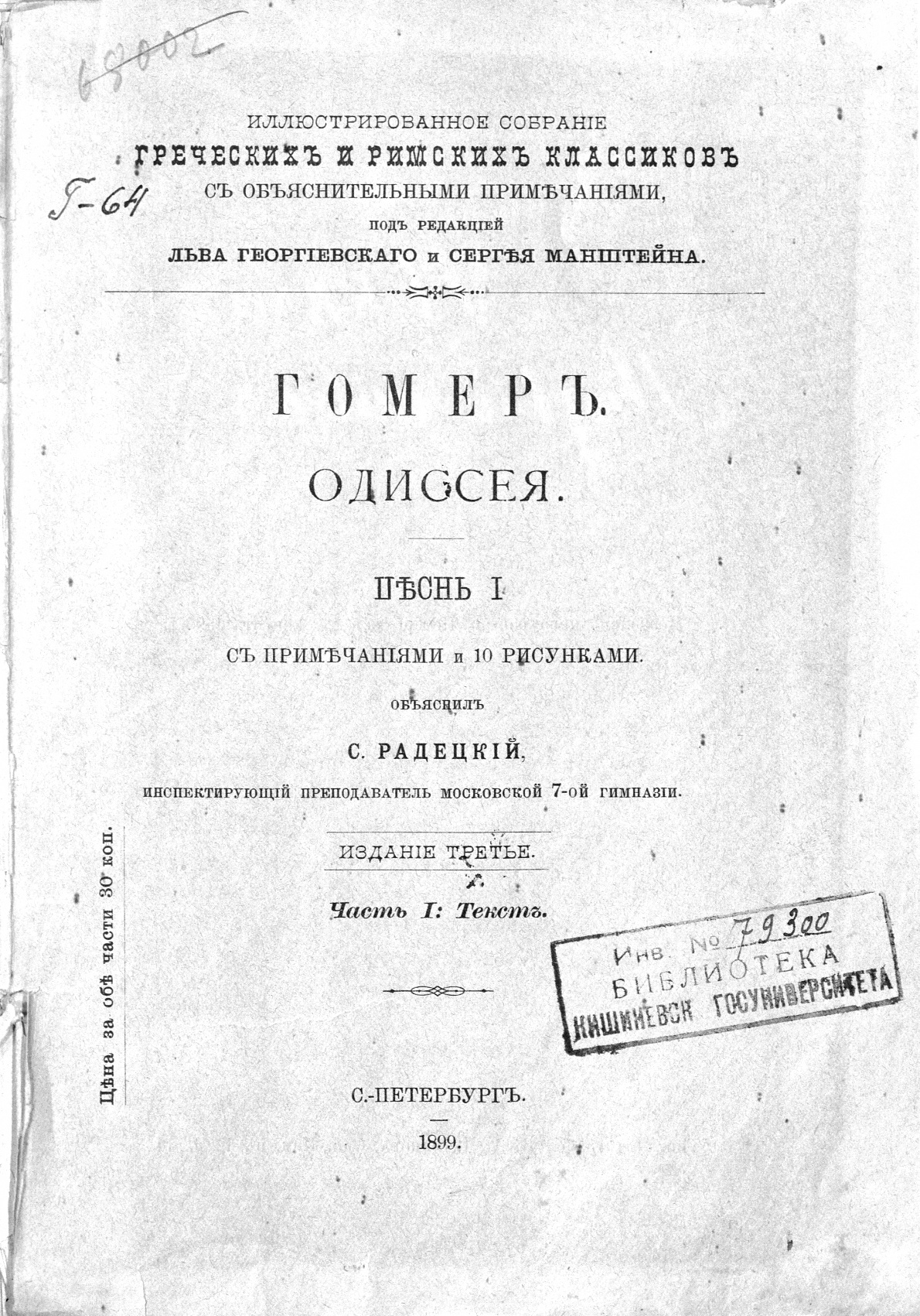 Гомер. Одиссея. Песнь 1 : С примечаниями и 10 рисунками : . Ч. 1 :...